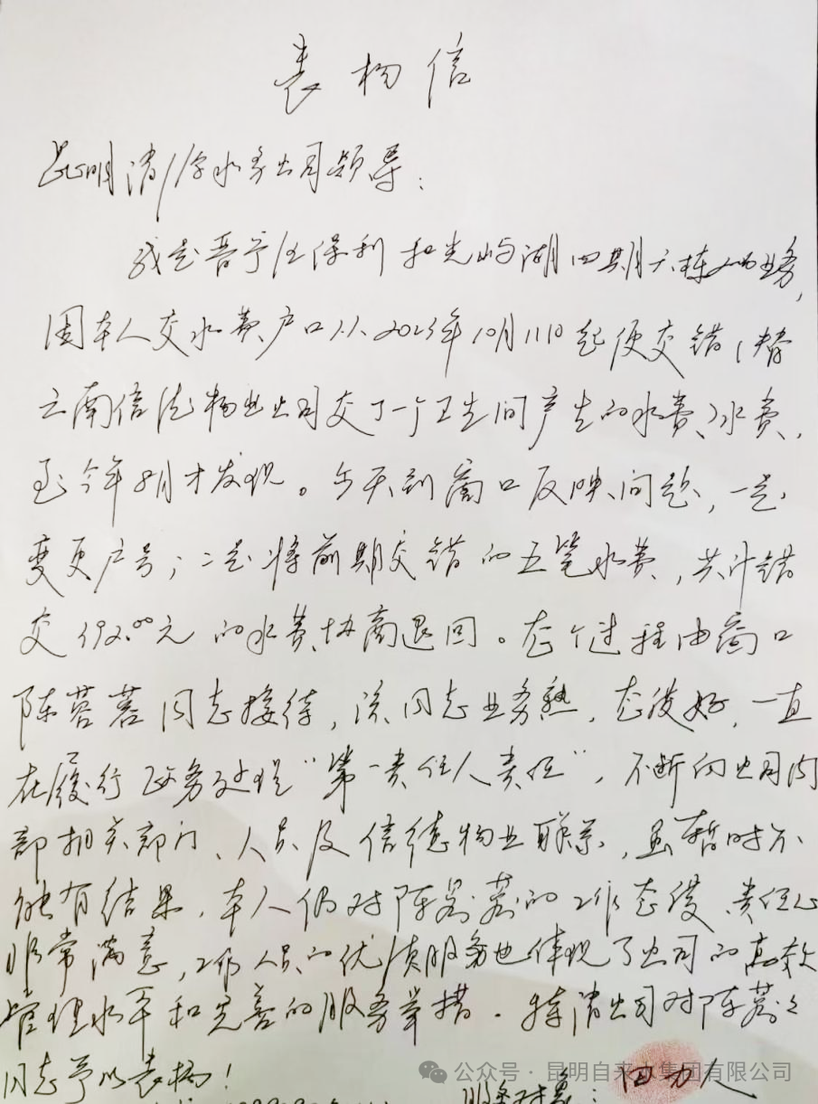 8月下旬,一位用户来到呈贡区自来水营业厅向客服人员求助,因物业提供错误用水户号,自2023年首次缴费起自己便误交他人水费,同时用户本人还开通了微信自动扣费功能,直至今年8月,才发现自己错缴水费。收到用户的诉求后,客服人员陈蓉蓉第一时间为用户查询缴费记录,并积极联系抄表员、物业公司全力协调处理,同时认真记录用户诉求,承诺持续为用户跟进处理水费的问题。水费错缴问题虽未当场解决,但用户却被陈蓉蓉认真尽责的态度深深打动,于是留下表扬信,特地提出表扬。目前,该用户错缴水费问题已得到妥善解决。