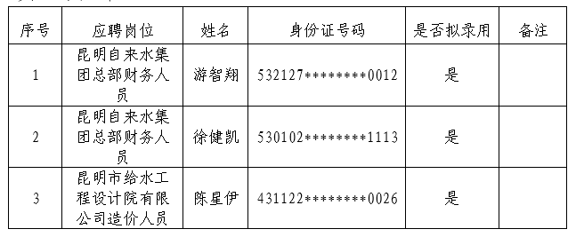昆明自来水集团有限公司2025年公开招聘拟录用人员名单公示